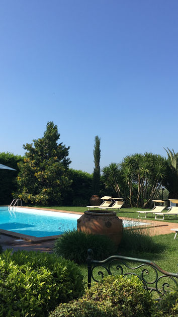The swimming pool surrounded by greenery enjoys a panoramic view over the Pontine plain.